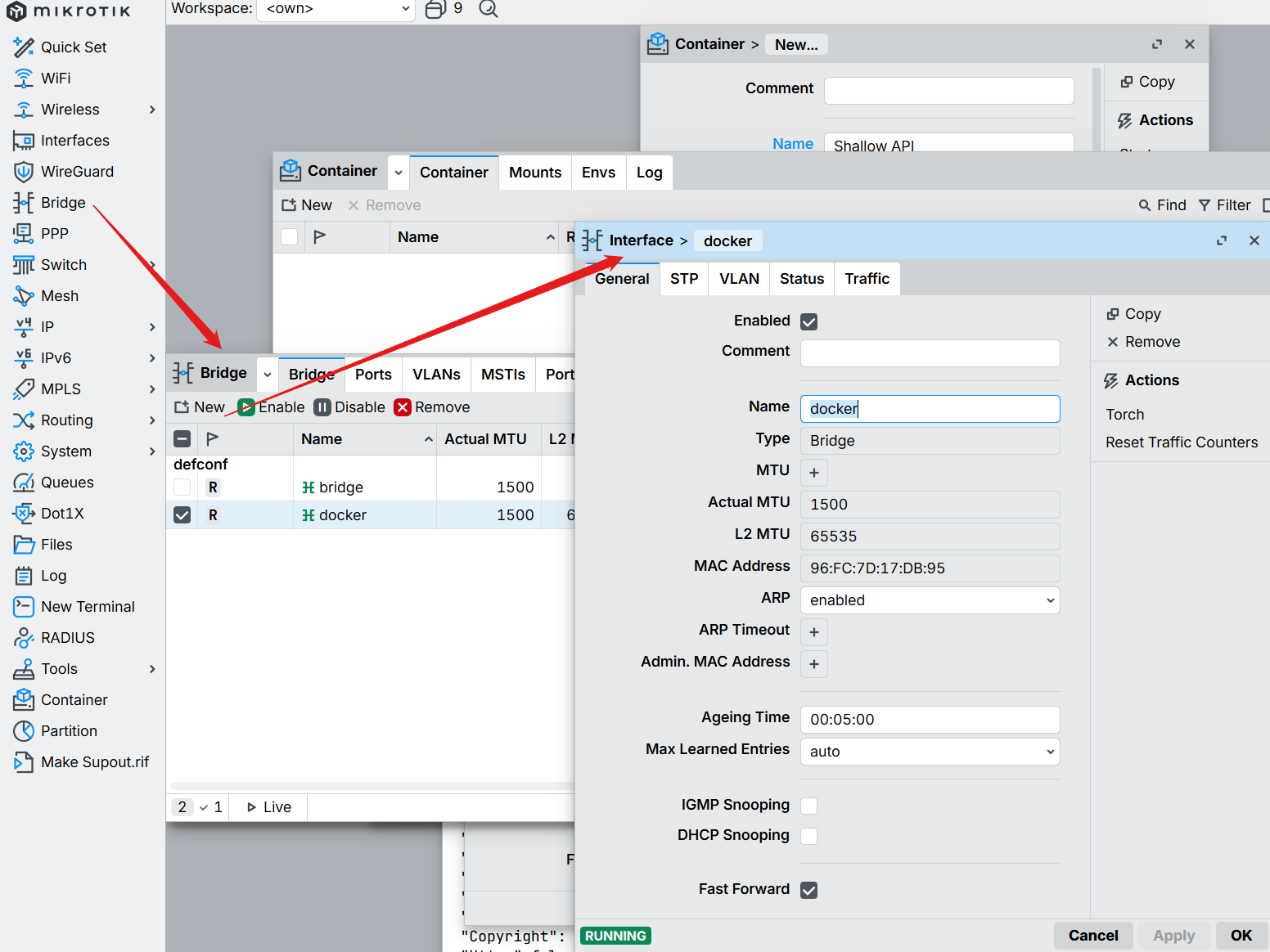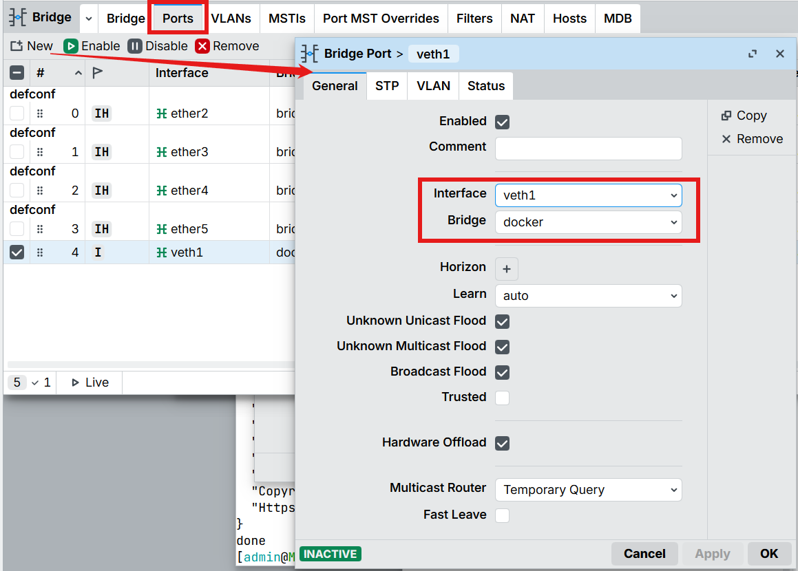 将veth1加入到docker网桥,即从属于docker网桥,进入/bridge/port,点击new新建端口,选择interface=veth1,bridge=docker