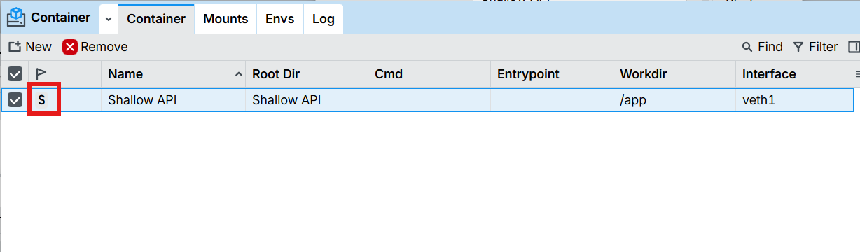 然后点击ok,此时会创建,flag状态是【S】,即Stop,如果是【E】说明Container还在解压中,需要等待解压完成,变为【S】