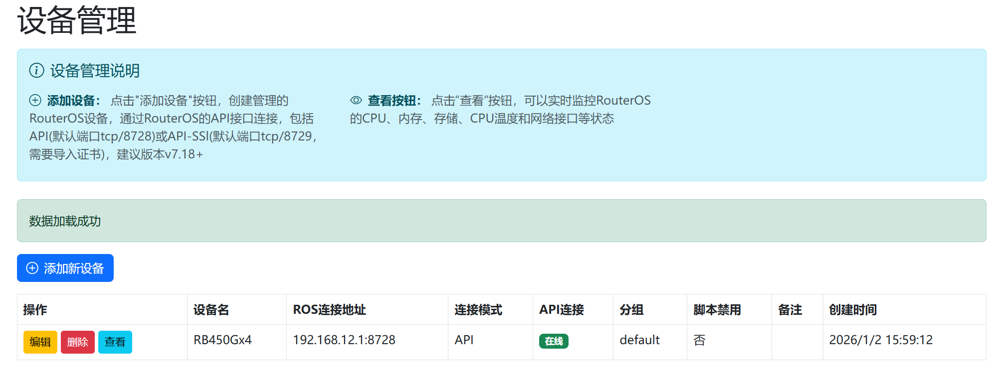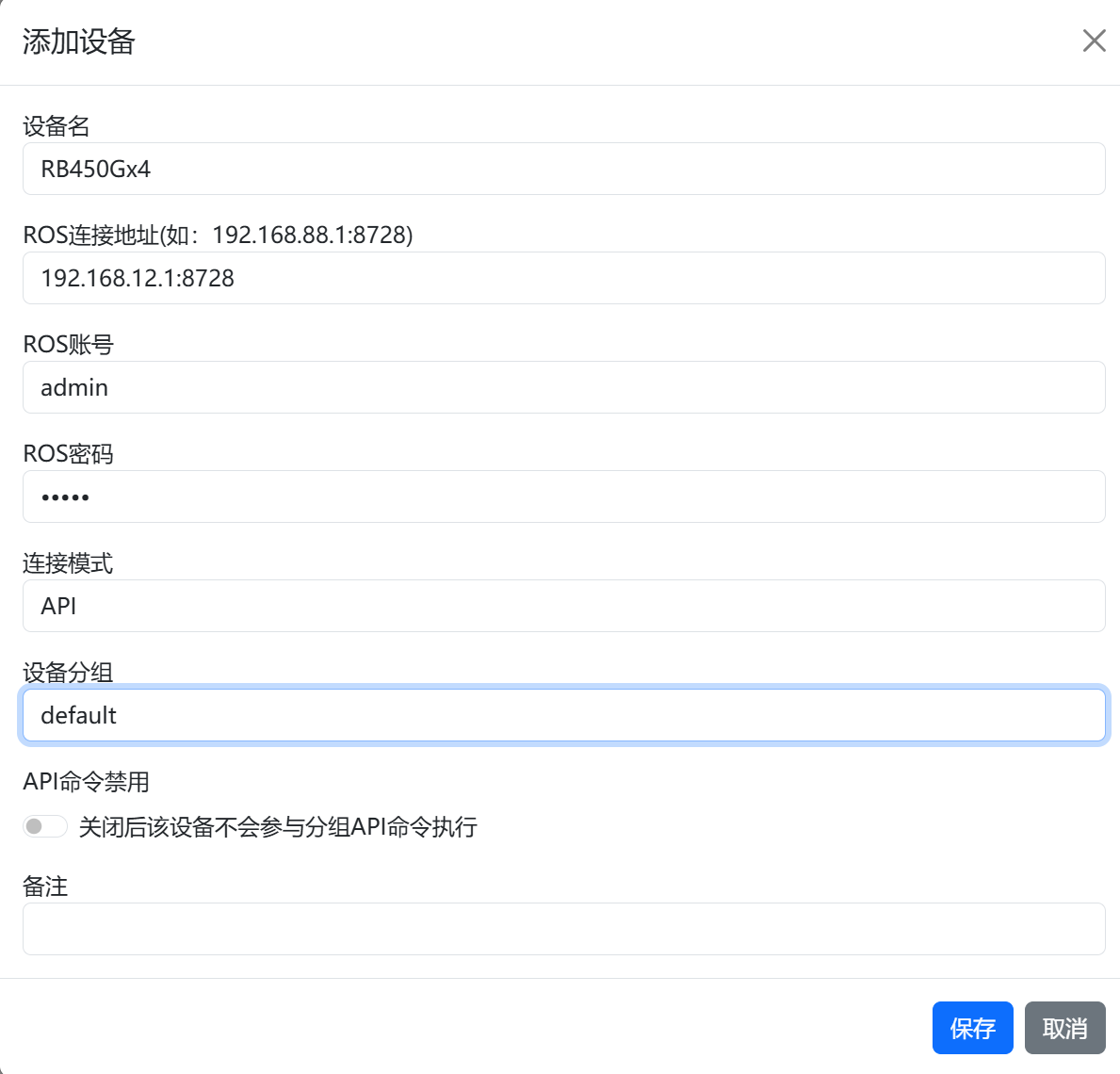 可以【添加新设备】,ROS连接地址为IP+API端口,填写ROS账号和密码,连接模式选择API或API-SSL,设备分组选择default