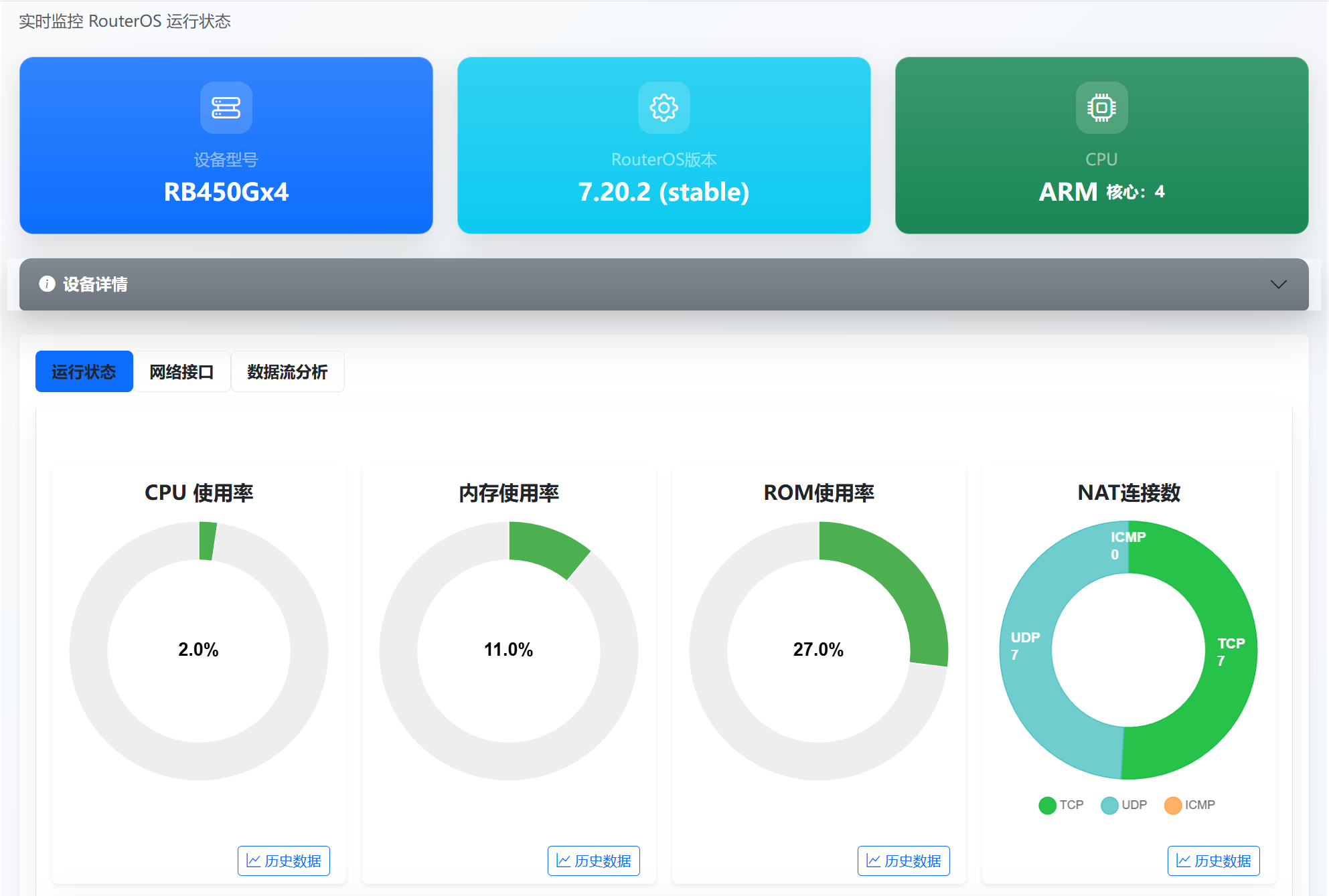 注:RB450Gx4(IPQ-4019 arm 4核心)在刷新页面时CPU消耗在40%左右,在后台自动获取数据时,在仪表盘或设备状态观察CPU消耗在7-10%左右上传tar文件