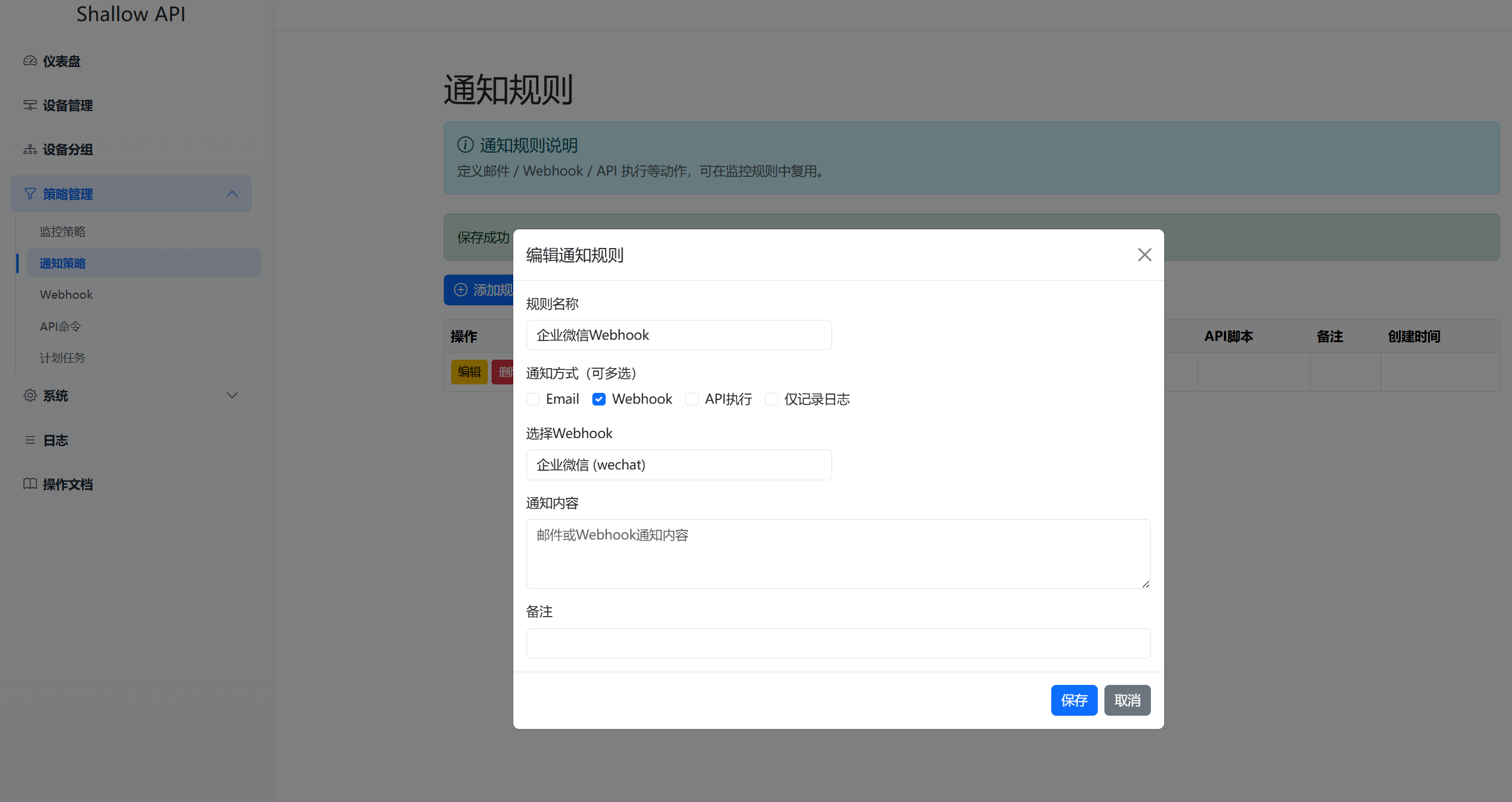 Shallow API手册 4.2 通知策略 通知策略,目前支持Email,Webhook和API脚本的通知和执行操作,当监控策略或系统探测到状态变动,则调用指定的通知规则并执行。设置Webhook通知,选择Webhook通知规则 企业微信 wechat