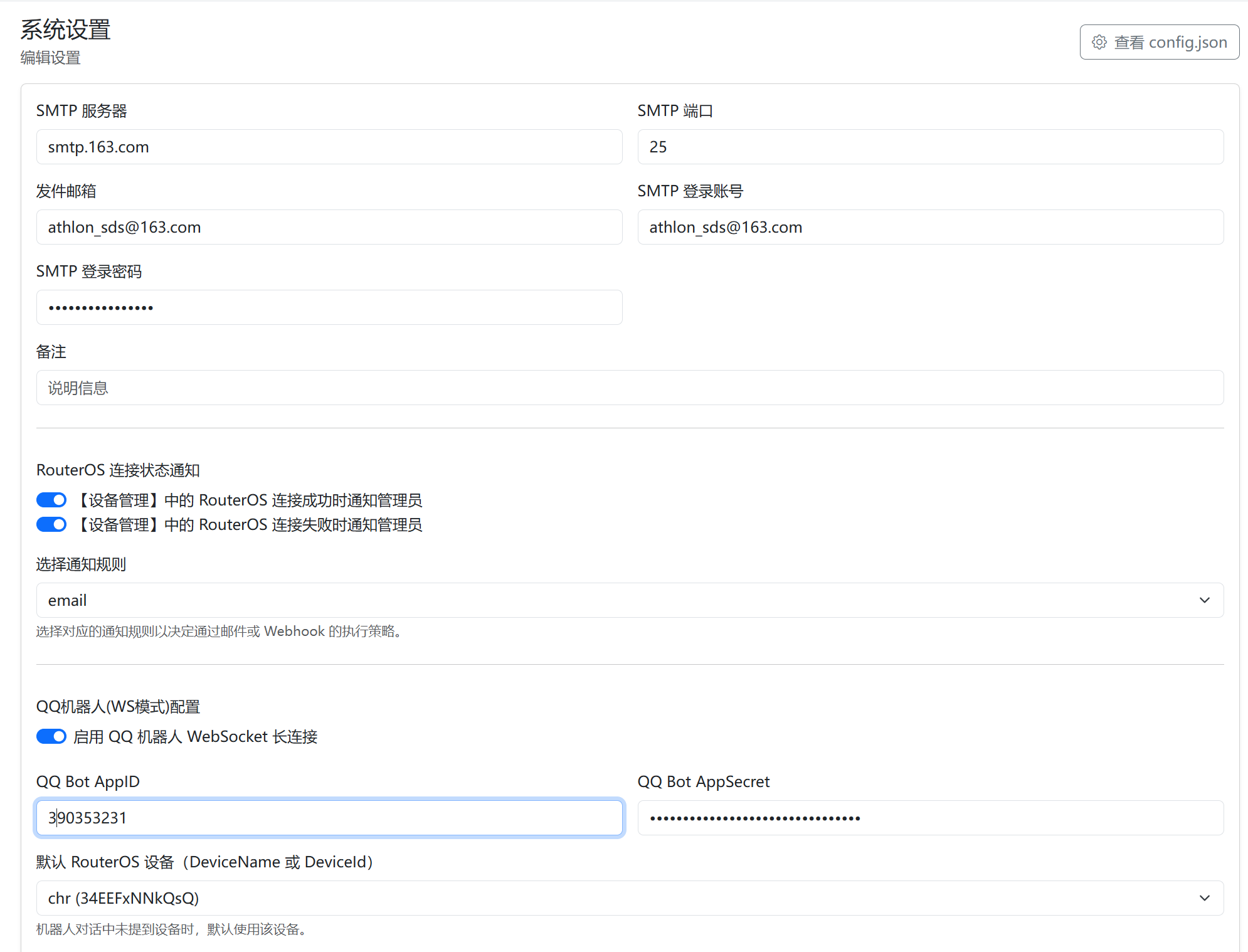 在v1.0.3版本增加了QQ机器人设置,支持基于WebSocket连接。需要到QQ开放平台注册(q.qq.com ),然后填写对应的AppID和Appsecret。选择默认通讯的RouterOS设备。