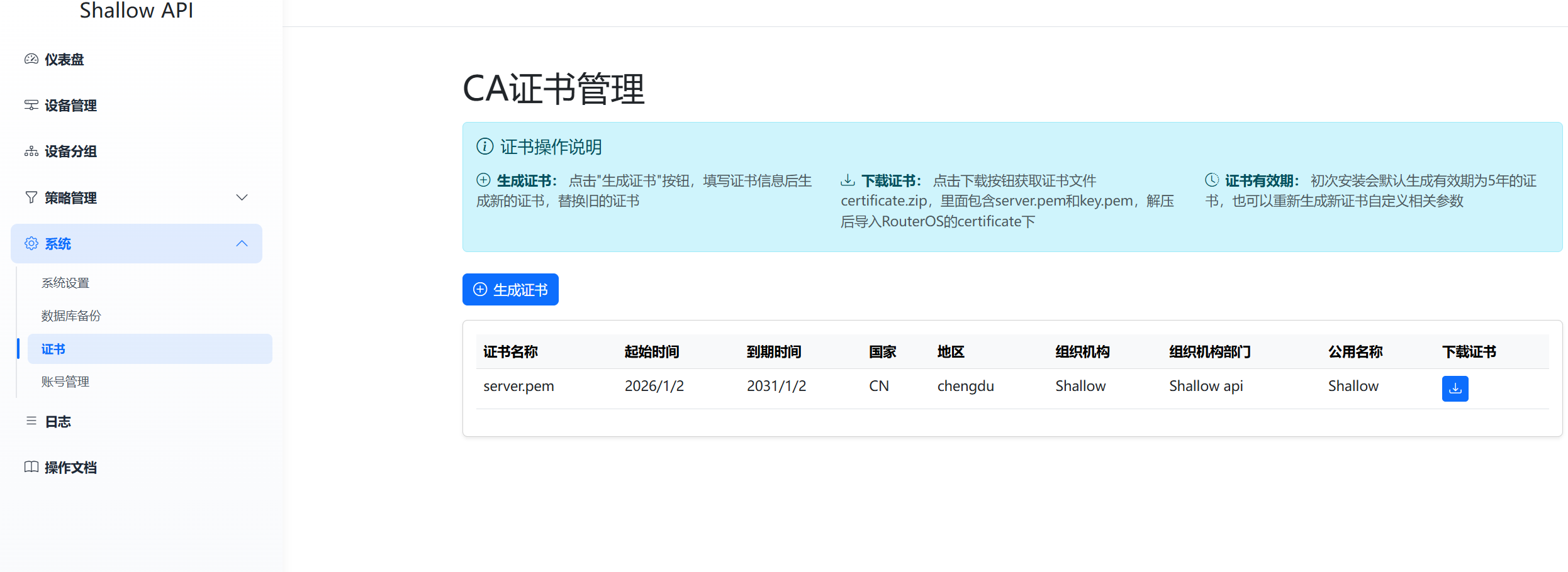 注意:自签证书是从Shallow API被第一次初始化开始生效,有效期5年。也可以点击【生成证书】重新生成一份新的。