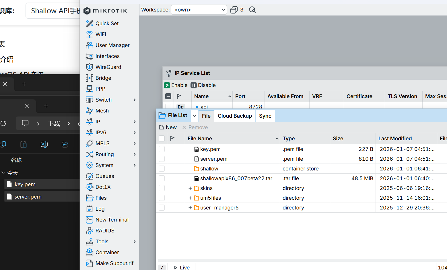 证书,可以创建和下载证书,用于https服务或RouterOS API-SSL连接。默认只能在Shallow API创建一份证书,这份证书同时可以用户Shallow API的https服务,也可以下载导入到RouterOS分配给API-SSL接口连接使用。