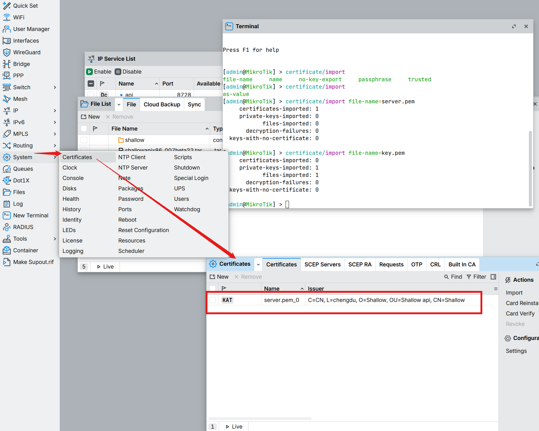 API-SSL连接,需要在Shallow API和RouterOS两端添加CA证书,Shallow RouterOS API初次安装会默认生成有效期为5年的自签证书,也可以重新生成一份新的自签证书