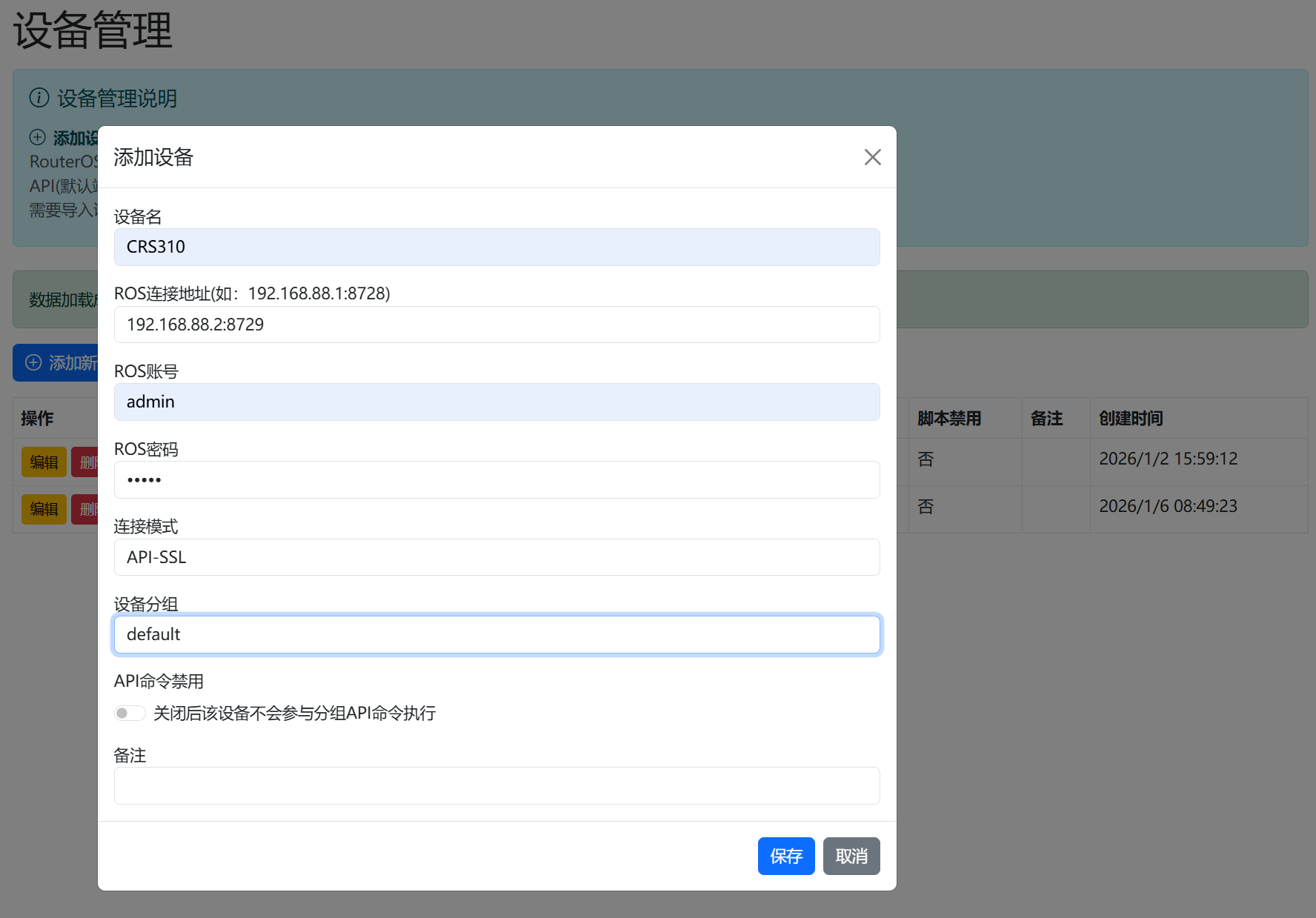进入设备管理,添加新设备,ROS链接地址的端口设置为8729,选择连接模式为API-SSL