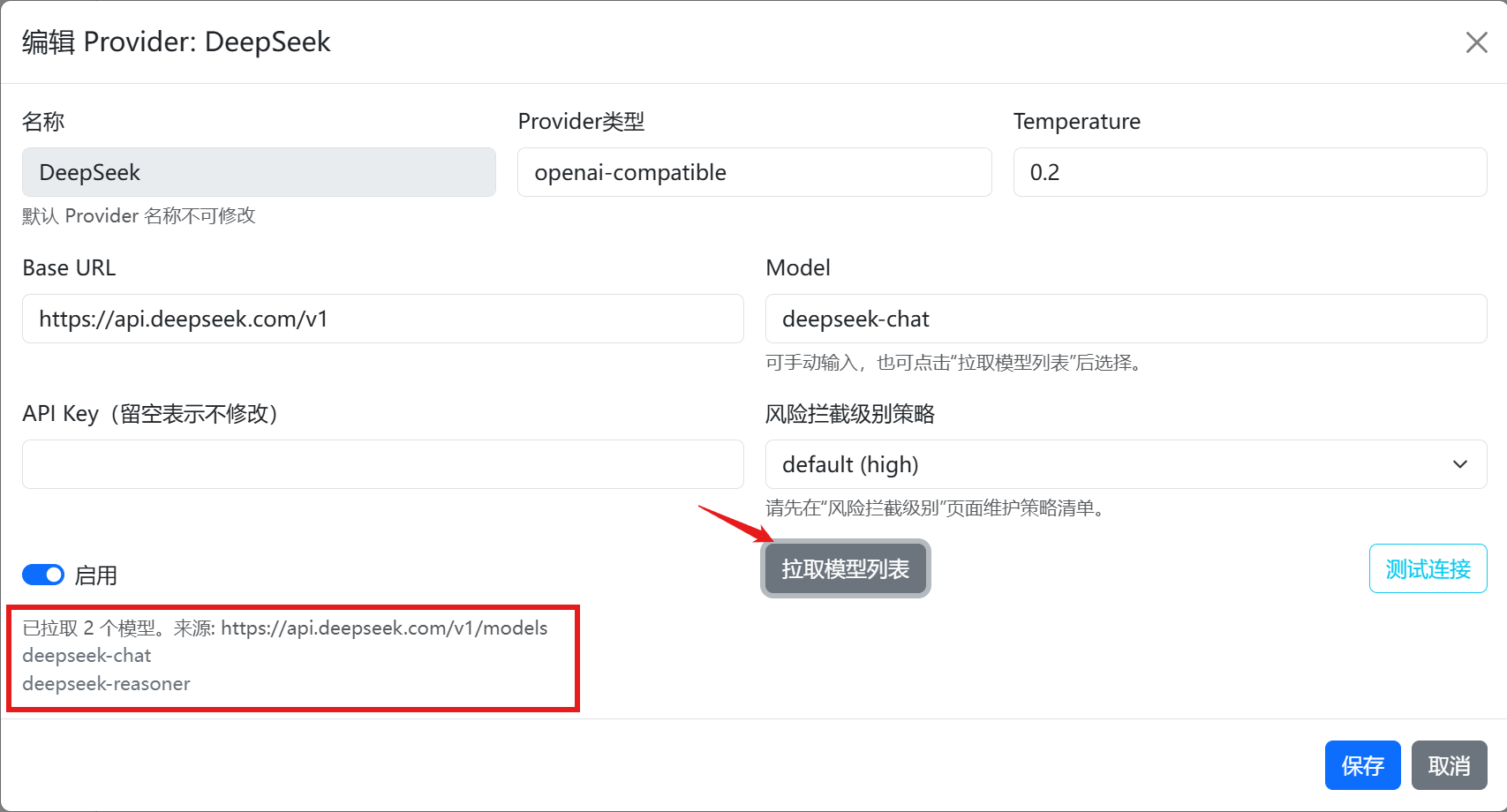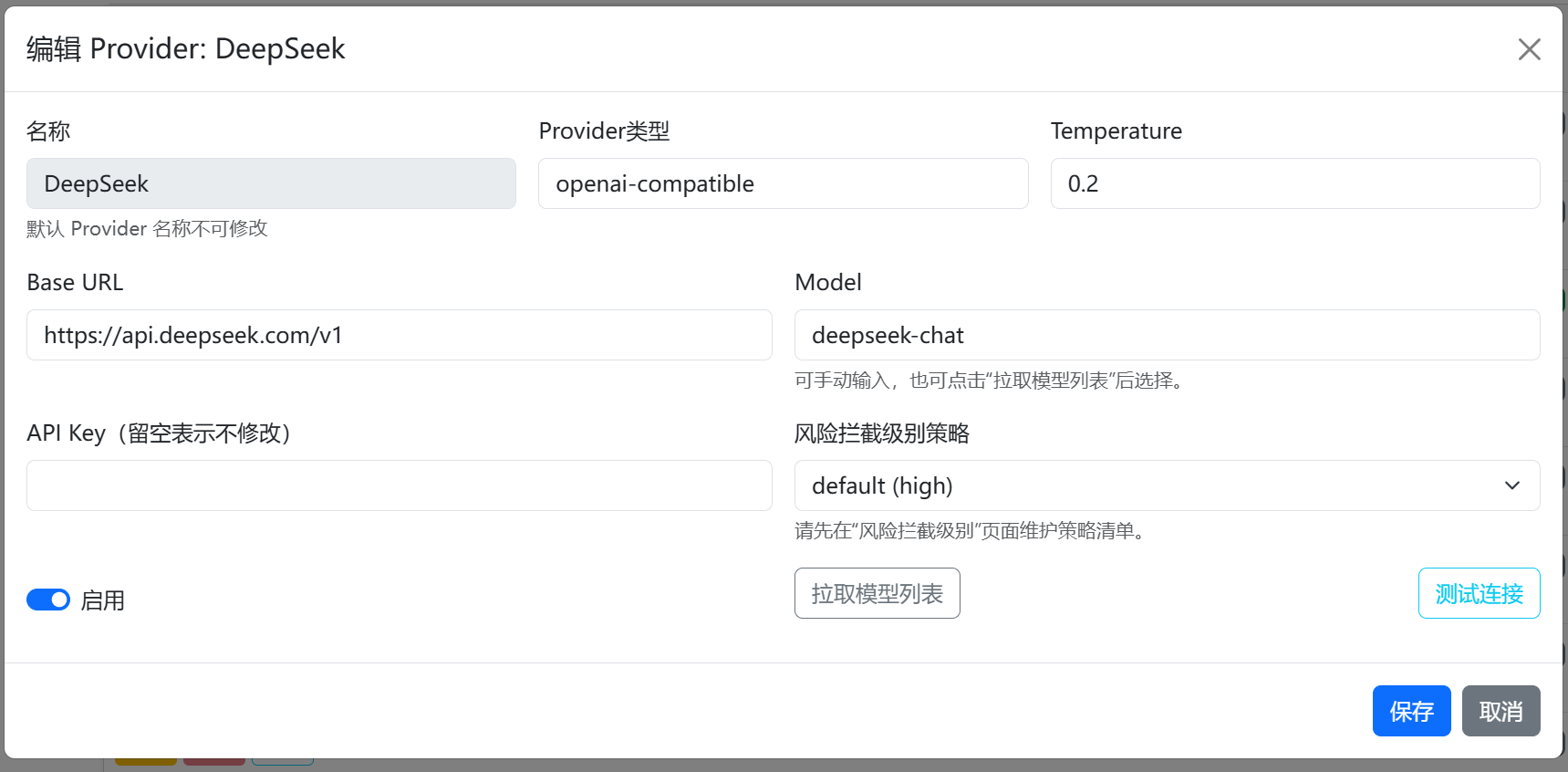 例如下面配置DeepSeek,需要你申请好的API Key填写,并填写Model模型类型,以及风险拦截级别策略,通常默认是最高。配置完成后需要点击启用