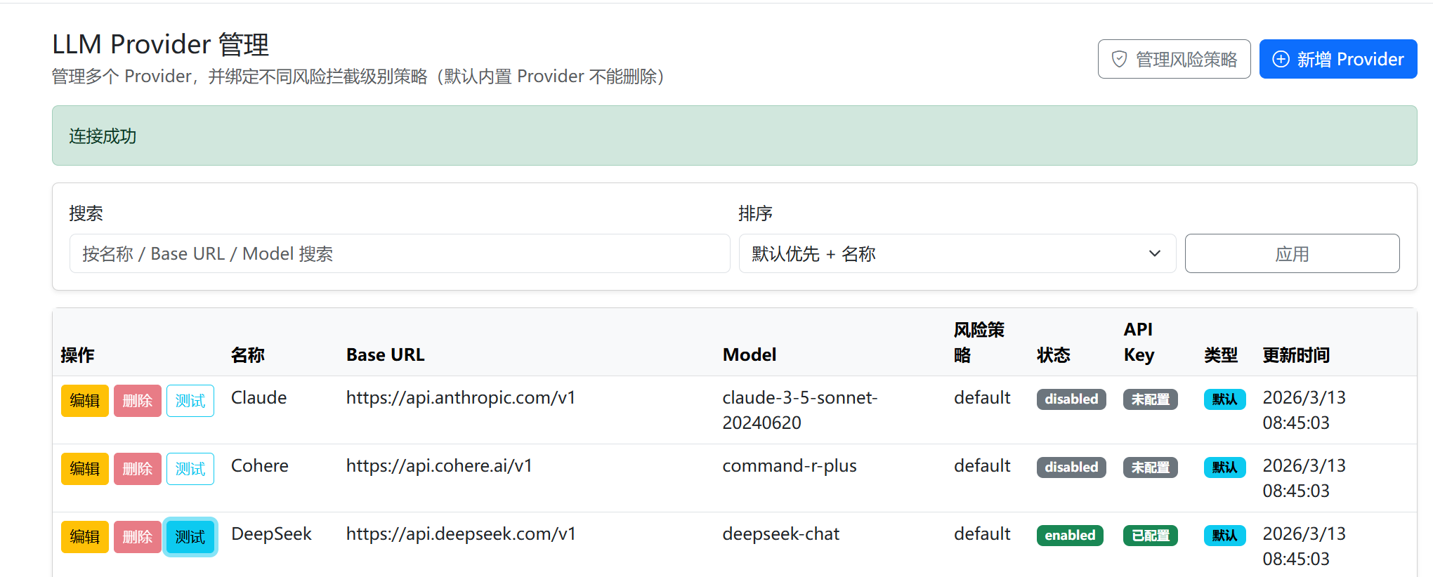 管理多个大语言模型商,并绑定不同风险拦截级别策略(默认内置模型不能删除)。