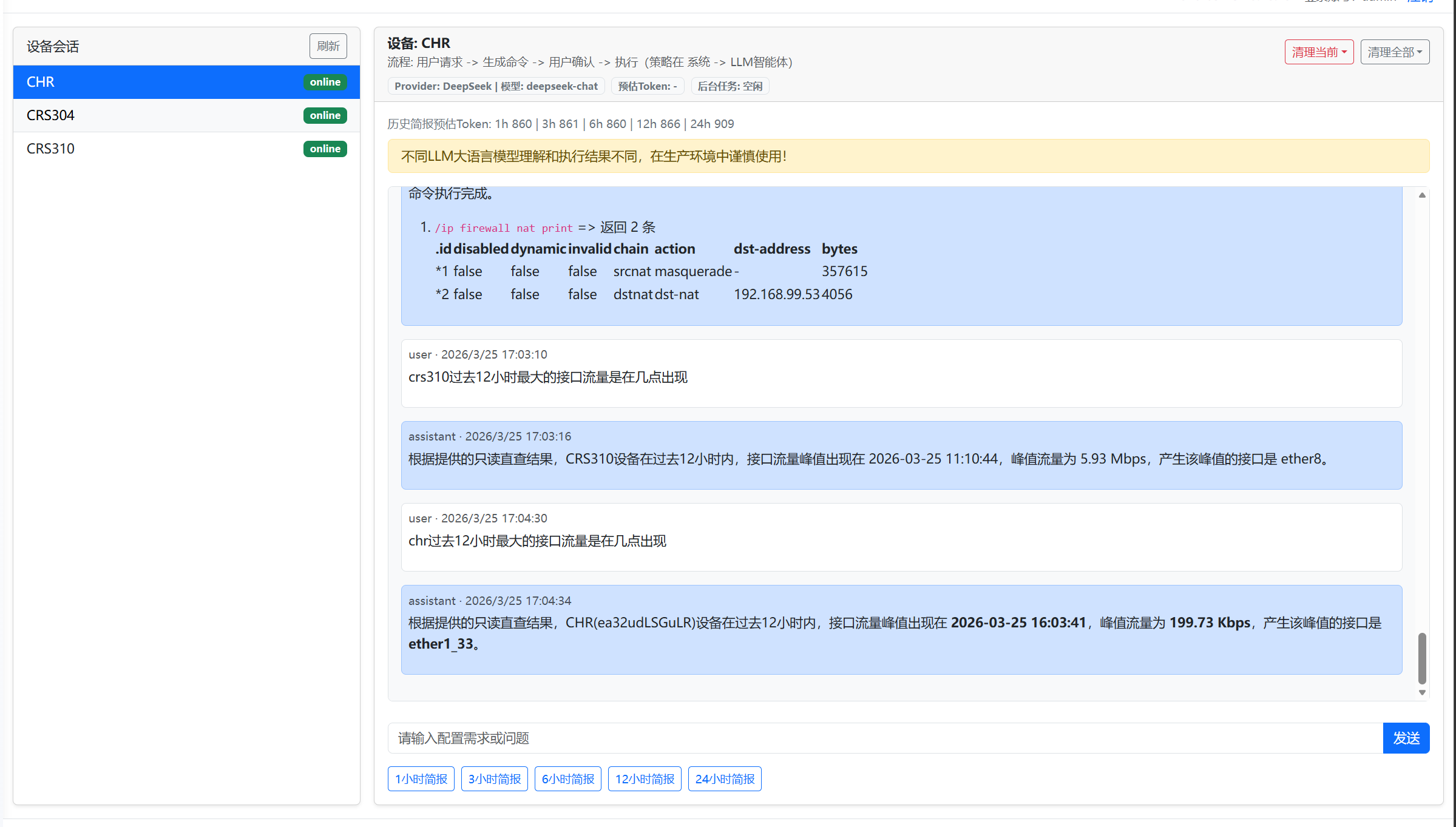 当需要查询当前状态,如CPU,内存,存储,网络接口和会话等数据时,不会重新建立API接口命令去RouterOS查询,因为在你的RouterOS设备已经添加到了【设备管理】中,会从本地缓存数据中读取,并注入到LLM,这样获取的信息更快,能减少Token消耗。