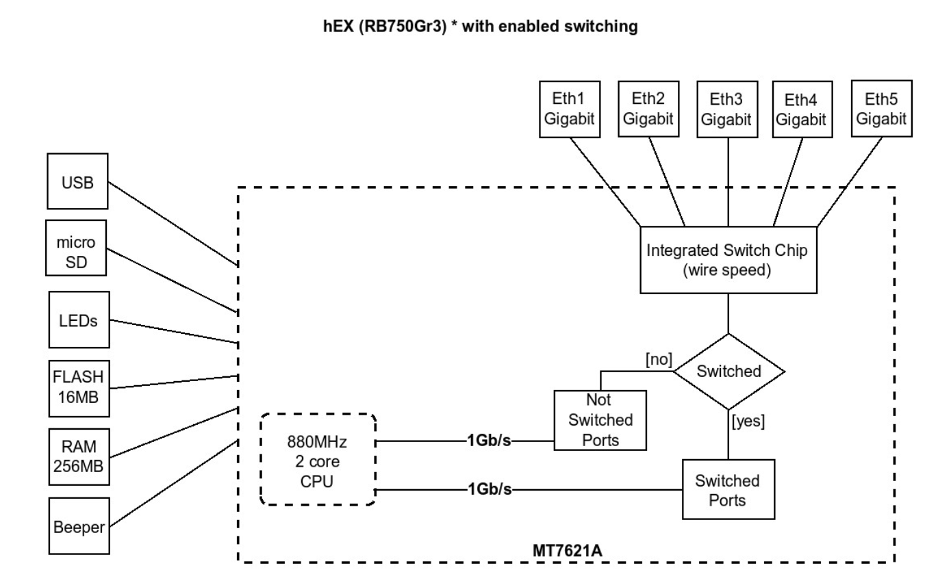 从RB760iGS的硬件设计图,可以看到SFP1端口不在交换机芯片,是独立的端口,所以无法支持硬件加速。