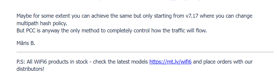 为此还咨询MikroTik官方关于v7的ECMP是否可以代替PCC的问题,官方并没有正面回答,ECMP某种程度上可以实现PCC功能,但认为PCC还是当前最好的选择。