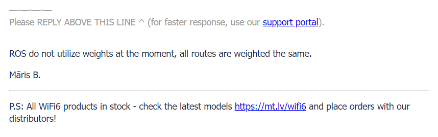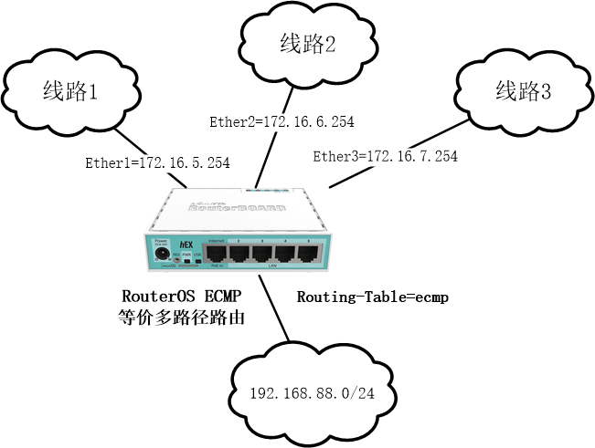 Linux的ECMP是支持权重参数,但在权重的配置上,RouterOS并没有添加这个参数设置,所有路由规则的权重是一样的,也就是说ECMP无法实现按照权重比例分配多线的负载,官方也没有计划添加权重参数。
