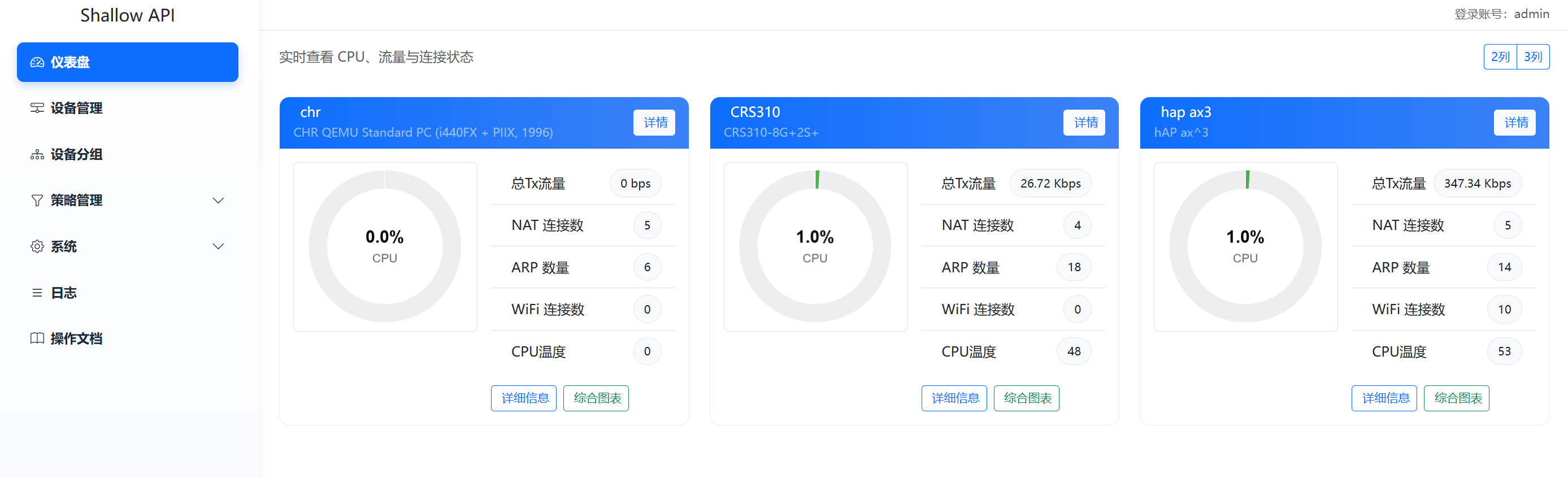 Shallow API是基于RouterOS的API接口搭建的一个管理平台,主要用于本地网络的RouterOS设备管理(也可以通过隧道远程管理),目前具备实时监控功能、通知报警和命令执行等,其他功能还在开发中...