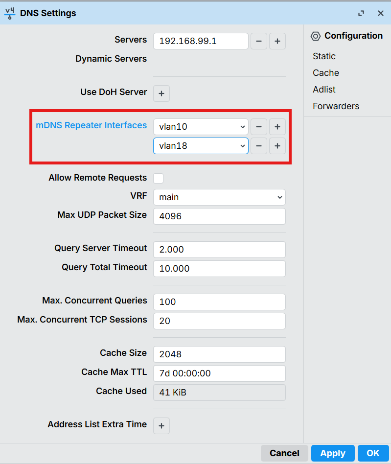 当RouterOS作为网关,并配置了多个子网段在不同接口上,希望通过跨子网中继 mDNS,允许连接发现跨子网的设备相互发现,在 /ip/dns 使用以下命令: