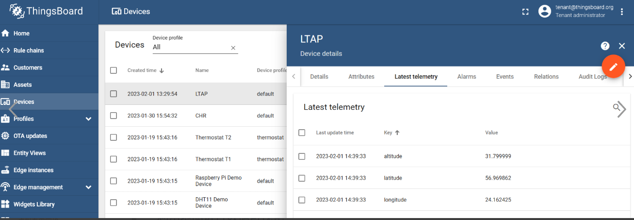 前往您创建的设备下的“Latest telemetry”部分,并确认数据已发布: