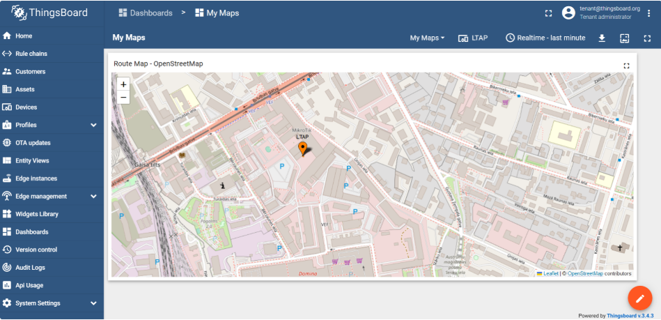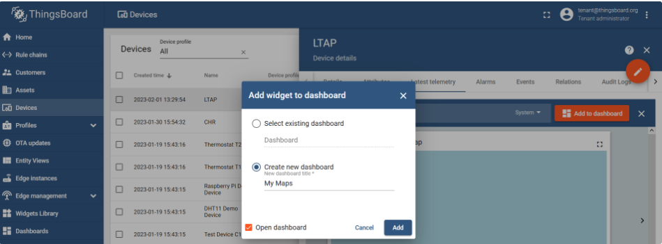 ThingsBoard 允许您使用 Widgets 小部件创建美观的仪表盘。在本例中,需要跟踪 LtAP GPS 坐标,因此需要一个地图小部件。