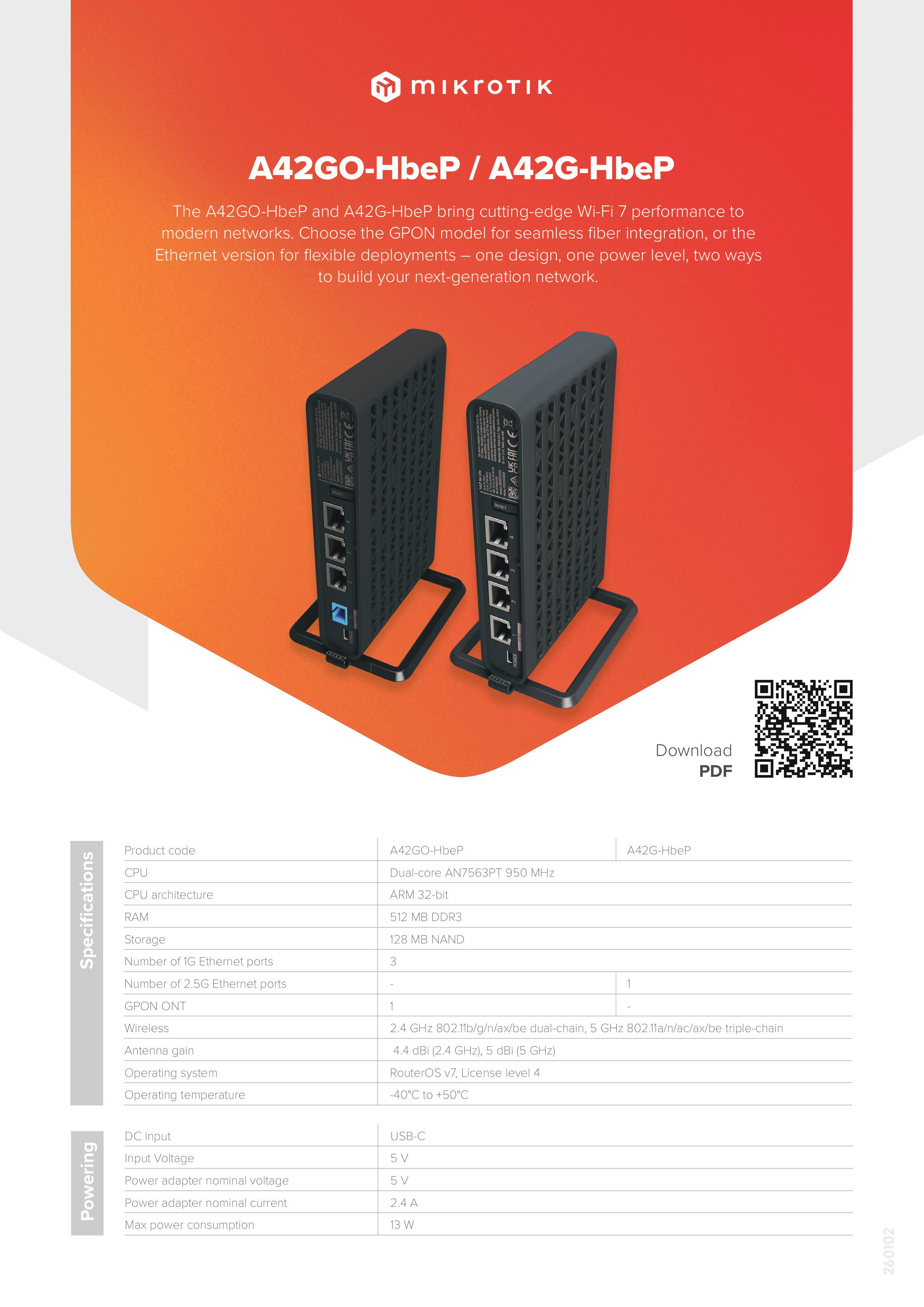 看起来有很多新东西,不过去年2025年MWC 发布的hAP ax GPON https://box.mikrotik.com/f/1f880747e77346a3bf7f/ 到现在还没有发售,可能已经胎死腹中,被A42GO-HbeP代替了吧?去年还有几款也是没有发售。这几款产品也是宣传手册,什么时候能发售还不清楚,至少不会在上半年。hAP be3从代理得到的消息预定已经4月份了,如果能拿到估计要5月。