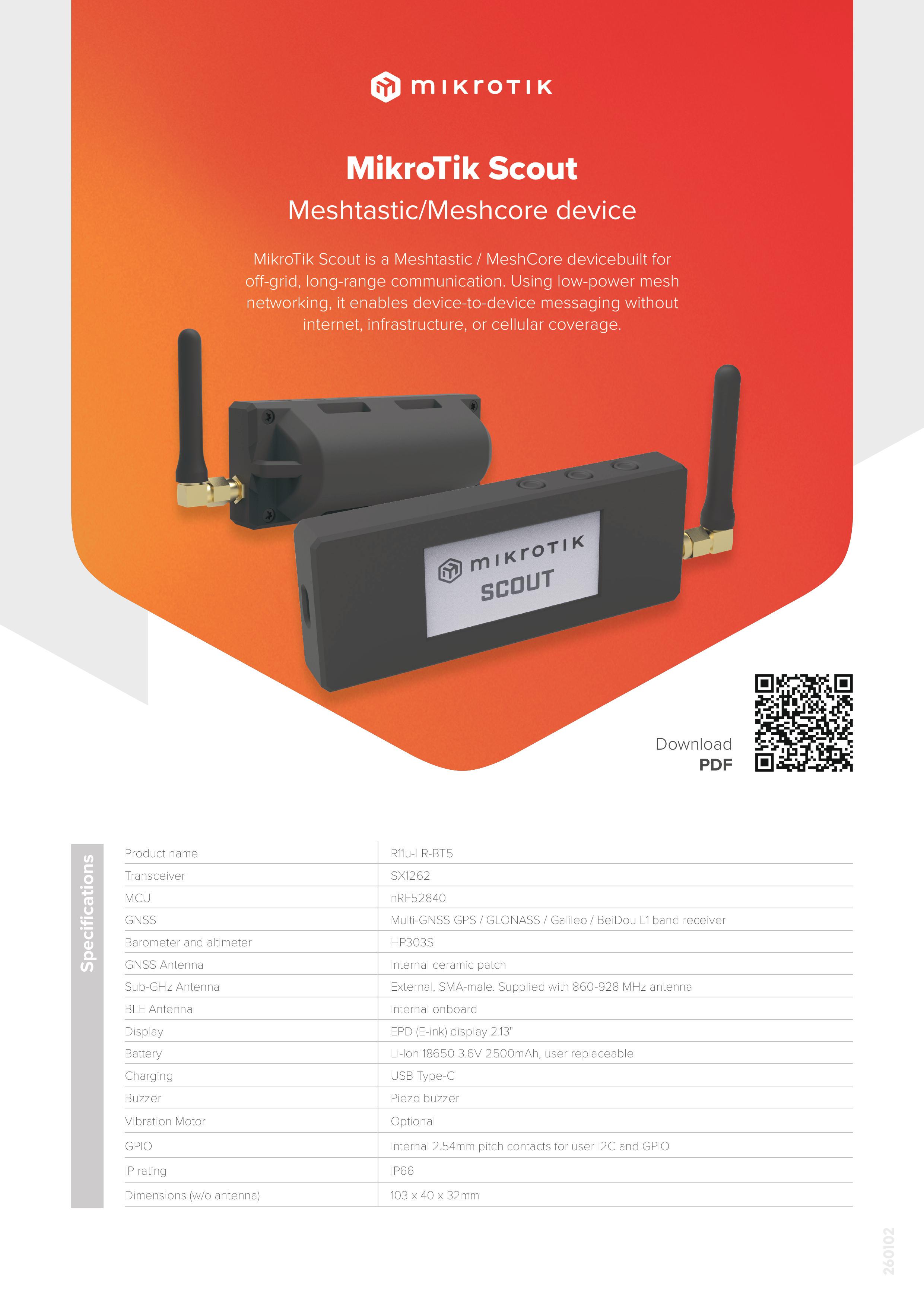 - MikroTik Scout 是一款主要面向 户外、应急、无基站环境通信 场景。实质是基于 LoRa Mesh 通信终端,是一台不用手机信号、也不用互联网,就能互相通信的“户外对讲+定位+组网设备” 。多台 Scout 之间,可以自己组网互相转发信息。使用 Sub-GHz 无线(860–928MHz)比 WiFi/蓝牙远得多,穿透力强,功耗极低。内置多模 GNSS:GPS、GLONASS、Galileo和北斗。配置电子墨水屏(E-Ink)2.13 英寸墨水屏。