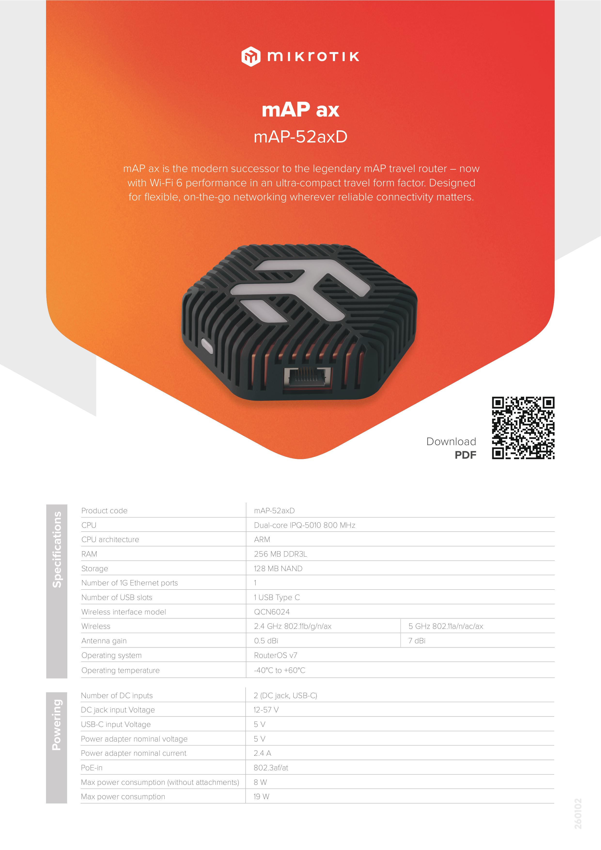 - mAP ax是一款轻便的WiFi 6路由器,用于商务出行的路由器。用于代替mAP,并且配置了双频WiFi 支持PoE和USB-C供电
